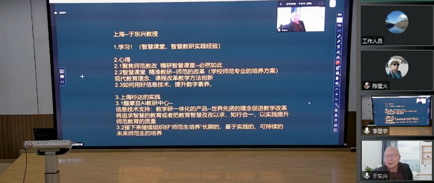 于東興教授圍繞“師范教改”進行線上點評,他提出利用人工智能創(chuàng)新教學教研方式,對師范教改有重要意義,希望以“師范生培養(yǎng)”為目標,連接更多智慧大學形成長期的,基于實踐的,可持續(xù)的聯(lián)盟組織。