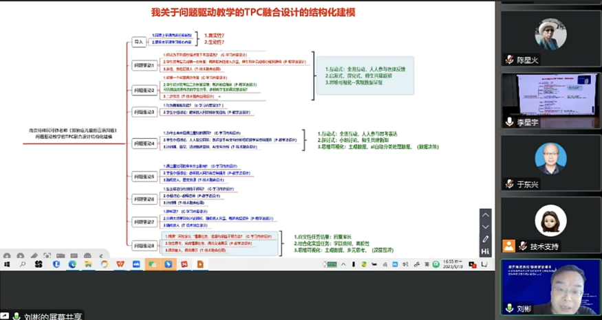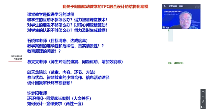 上海杉達學院漢語國際教育系主任于東興教授 劉彬教授結(jié)合本堂課的教研數(shù)據(jù)分享《學校問題驅(qū)動教學的TPC融合設(shè)計》。他指出課堂教學是金課的主陣地,師范高校的教改要從講授式教學轉(zhuǎn)變?yōu)檎鎸嵭郧榫笆綄W習,同時,高校打造金課要有“兩性一度”(高階性、創(chuàng)新性、挑戰(zhàn)度)的標準。他結(jié)合三位專家的點評建議,生成TPC融合結(jié)構(gòu)化模型,對本次活動具有參考意義。