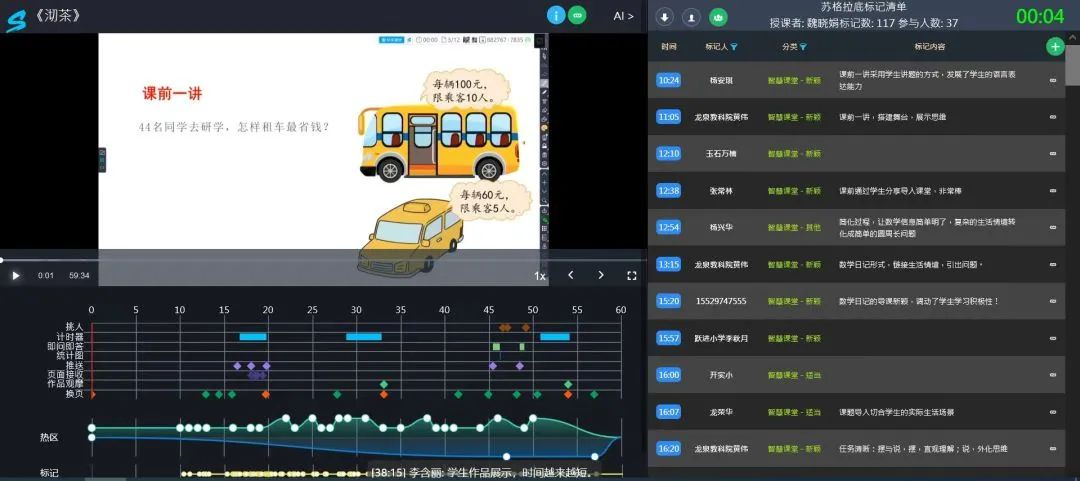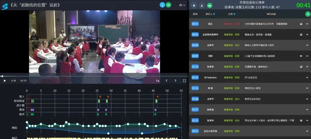成都市錦江區(qū)醍摩豆智慧教育研究院秘書長劉彬教授主持“在線議課·智慧教研”環(huán)節(jié)。智慧教研是提升教師專業(yè)水平的重要方式,數(shù)字化環(huán)境下的課例研究加持教研精彩,專家思維與AI融合生成人機智慧,教研更加科學智慧。在蘇格拉底平臺上,兩地專家、領導對課堂的點評內容均能查看,并可回溯到教學過程的任一片段,教研數(shù)據(jù)精準、實時可查。