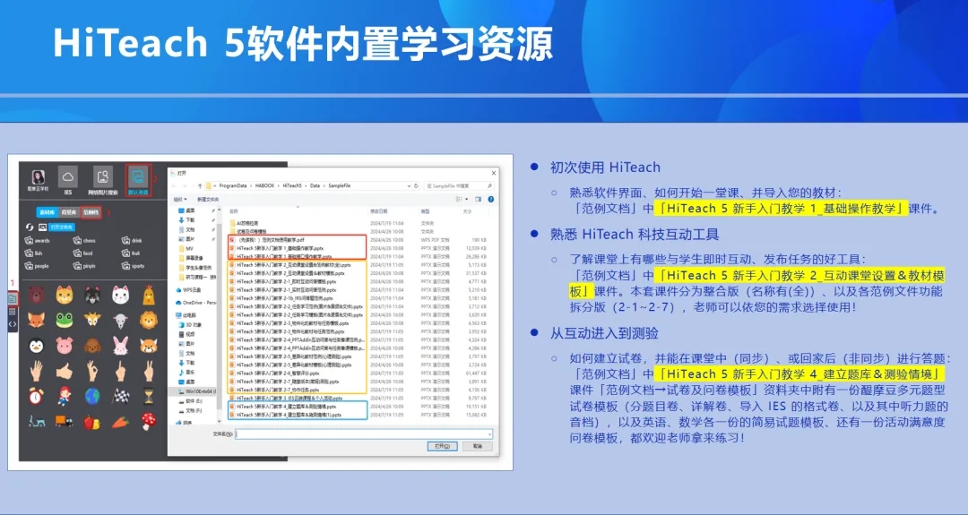 HiTeach范例檔是軟件內置教學資源,包含基礎教學,互動任務式、問答式教學,差異化教學,評分、協(xié)作、測驗等案例及操作流程,無論是新手老師還是有一定操作基礎的老師,都能在此找到對應的范例文件。