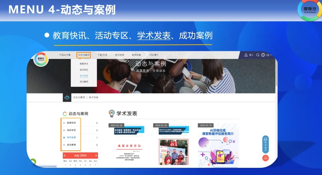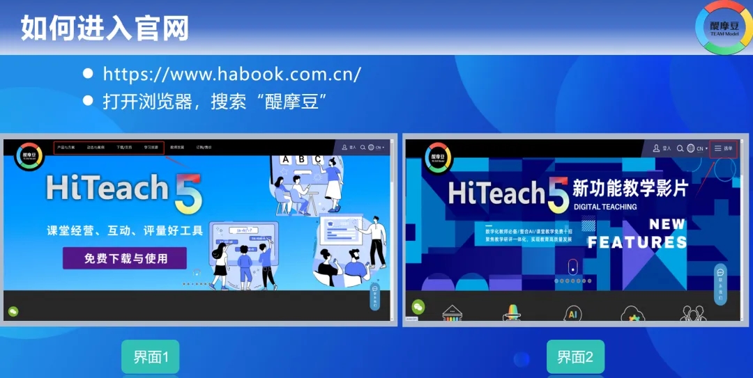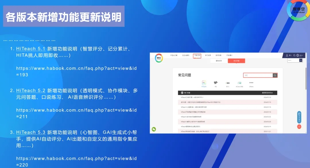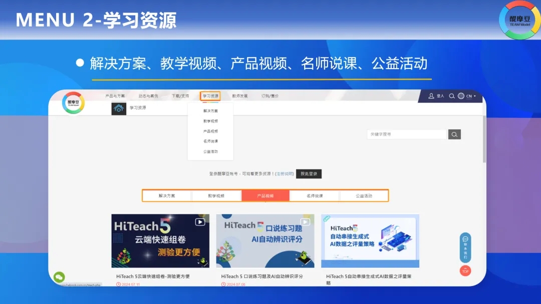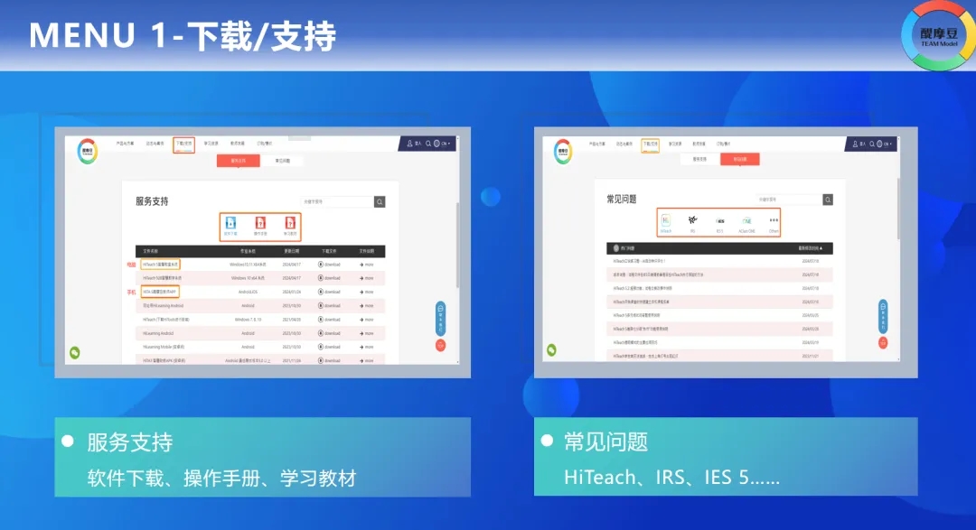 醍摩豆官網詳盡展示了教學研管評一體化的系列產品、解決方案、典型案例、操作流程等內容,老師們可以在這里下載HiTeach相關的各類軟件,了解每一款產品的功能特色及應用場景,為選擇最適合自己教學需求的解決方案提供參考。遇到疑問也可以在QA部分找到對應的解決方案,以及每個版本新增功能的特別說明。同時,我們特別開通教師學習專區(qū),羅列了解決方案、教學視頻、產品視頻、名師說課、公益活動等內容,老師們可以按需取用。