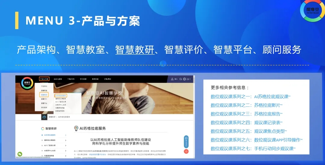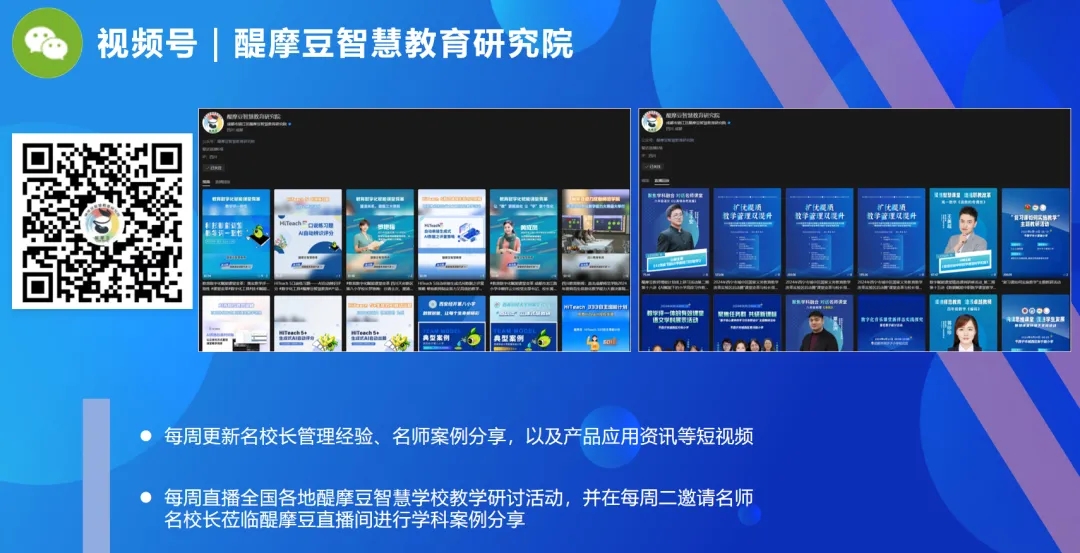 在視頻號,我們實時更新名校長管理經驗分享,讓您近距離感受教育領袖的智慧與風采;名師案例生動呈現,將教學藝術與教學成果直觀展現;產品應用資訊速遞,帶您領略醍摩豆智慧教育產品的實際應用與成效。此外,我們還直播全國各地醍摩豆智慧學校的教學研討活動,讓您仿佛置身現場,與眾多教育同仁共襄盛舉。同時每周二晚,視頻號特別邀請名師名校長蒞臨醍摩豆直播間,進行深度學科案例分享,為您帶來前所未有的學習體驗與靈感碰撞。