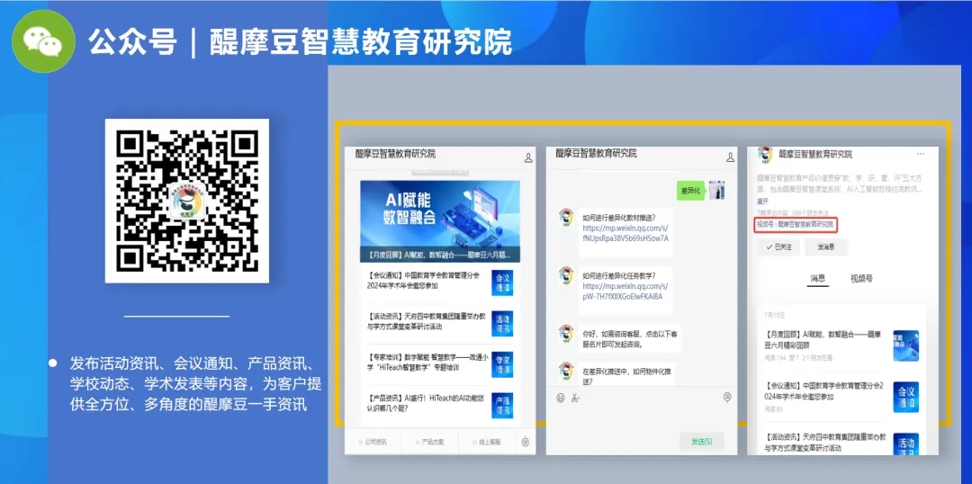 微信公眾號:醍摩豆智慧教育研究院。這里,是獲取醍摩豆最新動態(tài)的一站式窗口。我們精心策劃并發(fā)布各類活動資訊、會議通知,讓您第一時間掌握行業(yè)盛事;產品資訊詳盡全面,助您深入了解醍摩豆智慧教育解決方案的最新進展;學校動態(tài)頻傳,分享合作學校的變革故事與成功實踐;更有學術發(fā)表精選,匯聚教育智慧,啟迪未來教育之路。我們致力于為客戶提供全方位、多角度的醍摩豆一手資訊,助力教育創(chuàng)新與發(fā)展。