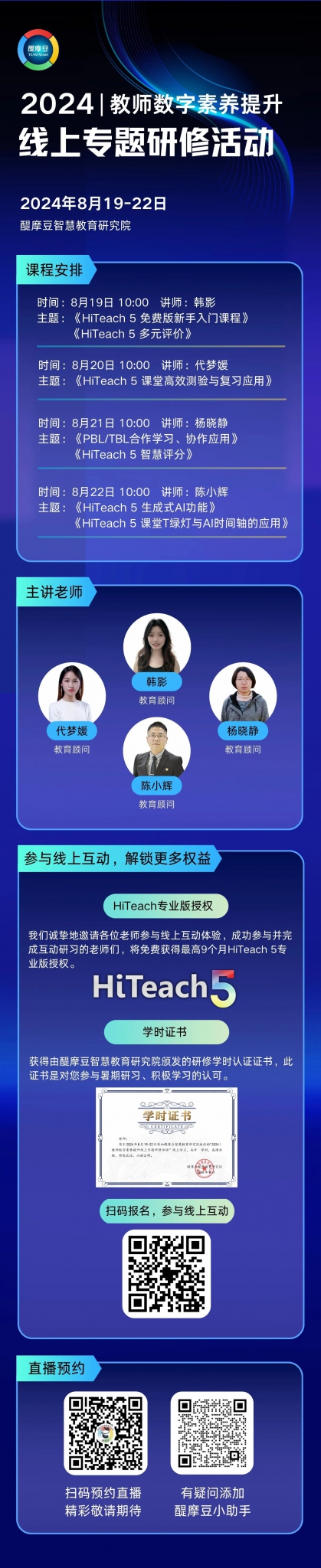為深入學(xué)習(xí)黨的二十大精神,扎實(shí)推進(jìn)國(guó)家教育數(shù)字化戰(zhàn)略行動(dòng),積極推動(dòng)教師學(xué)習(xí)方式變革,全面提高教師利用數(shù)字技術(shù)優(yōu)化、創(chuàng)新和變革教育教學(xué)活動(dòng)的意識(shí)、能力和責(zé)任,醍摩豆智慧教育研究院決定開(kāi)展“2024|教師數(shù)字素養(yǎng)提升線(xiàn)上專(zhuān)題研修活動(dòng)”,旨在幫助教師熟練掌握HiTeach 5最新功能及常用工具,促進(jìn)教師數(shù)字化素養(yǎng)提升,提升個(gè)人專(zhuān)業(yè)發(fā)展,助力課堂輕松教學(xué)。